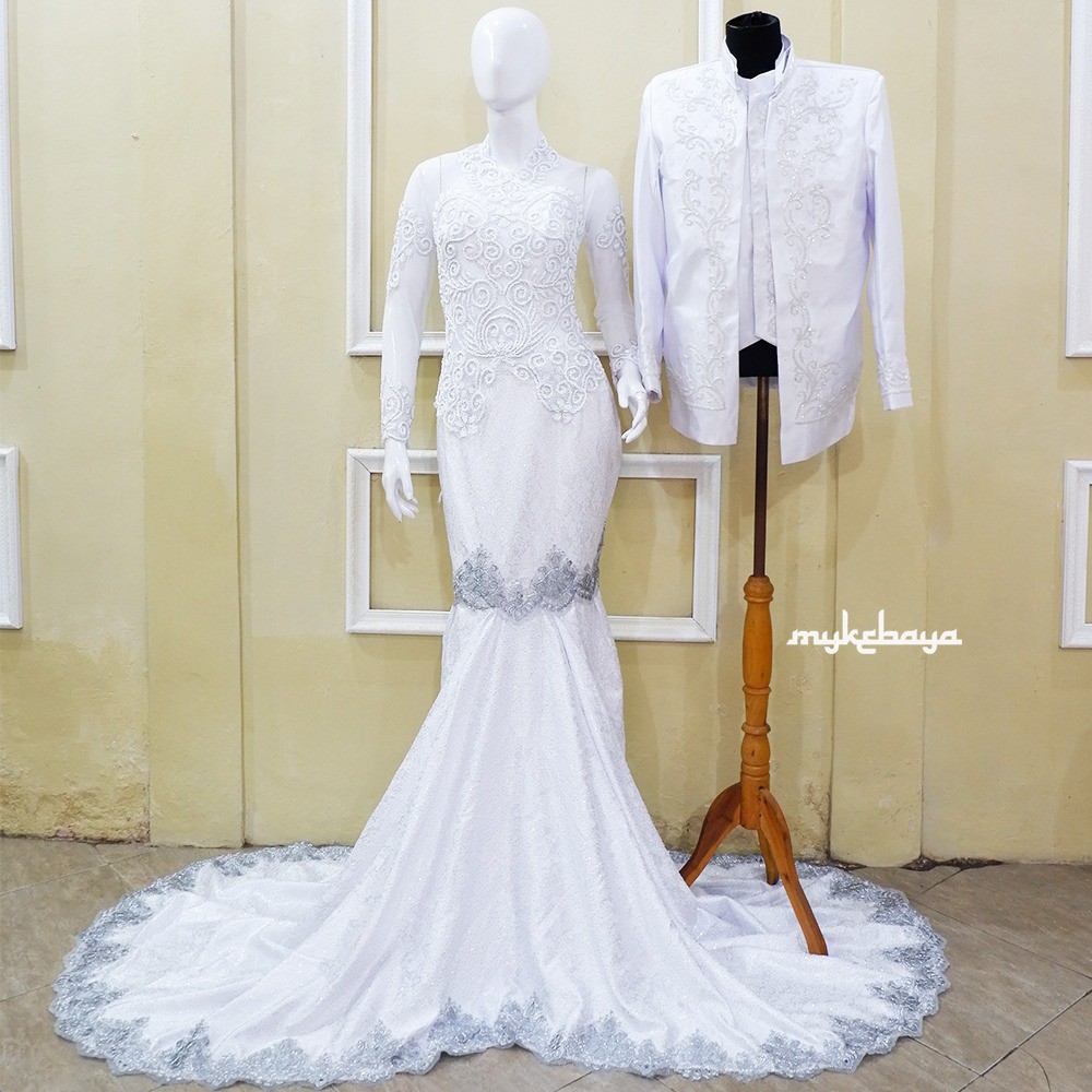 Batik lie pasangan pengantin kebaya payet dan jas pria nikah baju pengantin muslim putih basofi akad nikah.